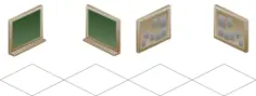Sets of black and notice boards are drawn in isometric perspective.