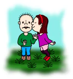 Cartoon image of girl and boy kissing.
