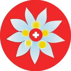 Red background with white geometric flower and Swiss cross.