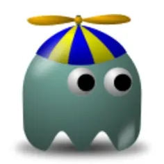 Vector illustration of a geek bad guy from arcade games. Color drawing of a dark green pacman with propeller on top of his head.