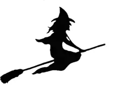 Silhouette vector graphics of witch on broom. Black and white clip art of flying witch with blank background.
