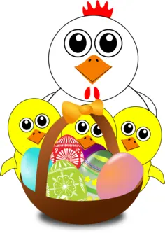 Color vector drawing of a chicken and three small chicks behind a basket full of Easter eggs. Yellow chicks serving painted eggs with mum.