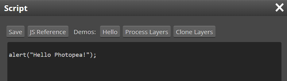 使用"脚本"窗口使用脚本。在这里,您可以键入(或粘贴)一个新脚本,然后单击"运行"来执行它。脚本窗口顶部提供了几个演示。脚本也可以通过photopea api执行